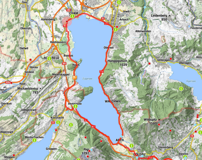 You can find the GPX file to the 68 km trip here. We only did the northern part as of Goldau. Perhaps the southern part is more beautiful and calm?