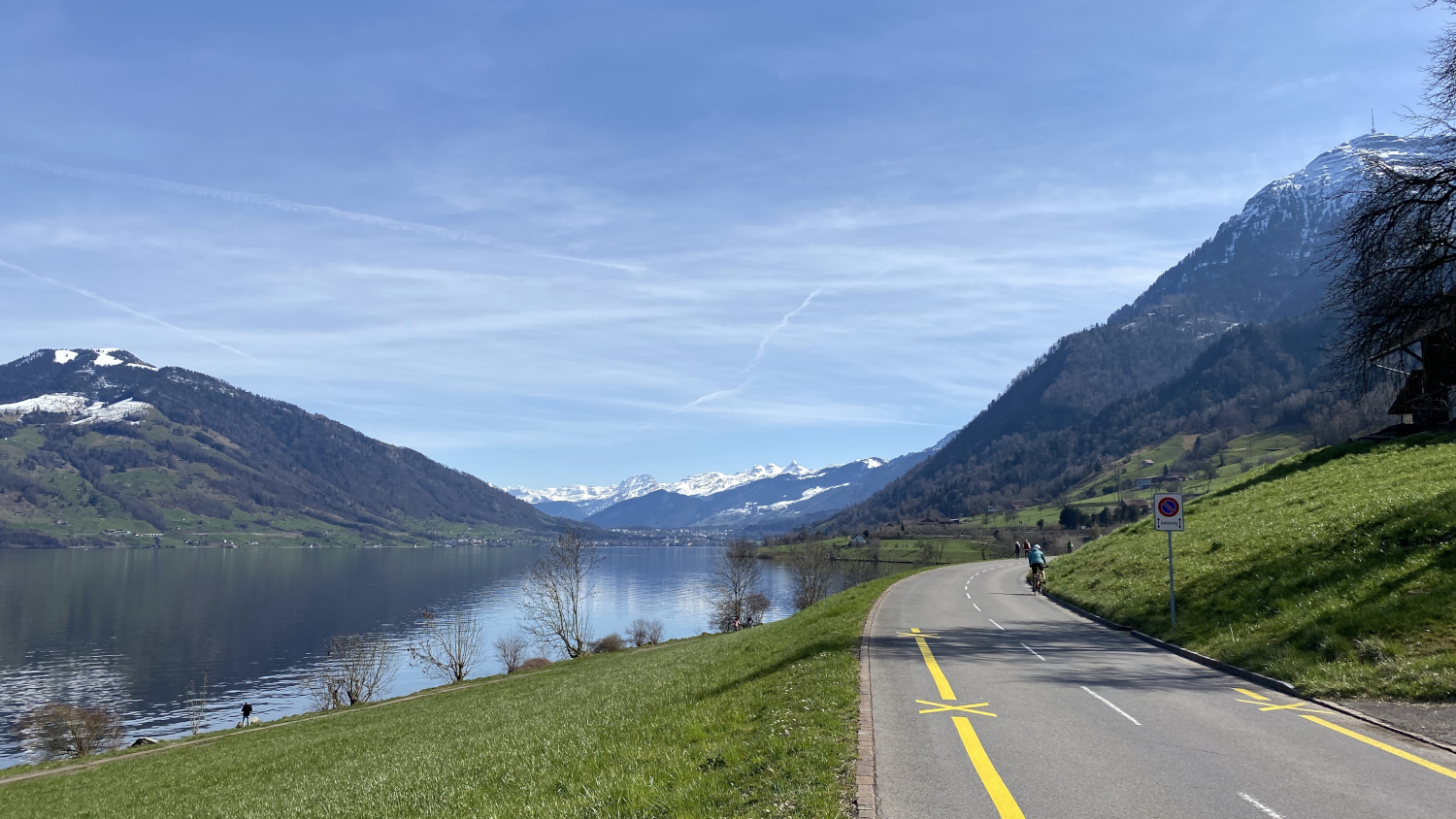 We recently surrounded the Lake Zug in a few hours by bicycle. It’s not an ideal route I can recommend, unfortunately. The problem: the majority of the route is on streets where the car traffic rate is too high. This reduces significantly the enjoyment of the great landscape and the amazing views on the snowcapped mountains.